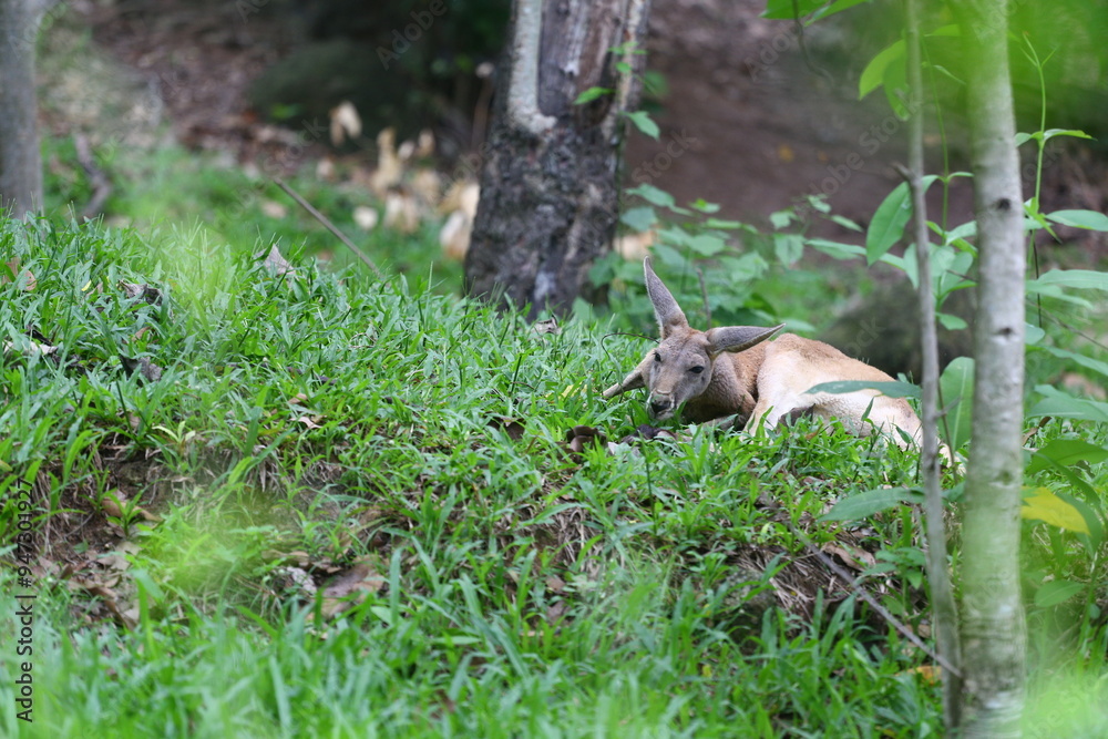 Kangaroo is lounging and curious in a temperate forest.