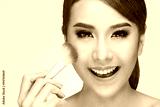 portrait of asian woman applying dry cosmetic tonal foundation on the face using makeup brush, on pink background with clipping path.