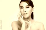Spa Woman Portrait. Beautiful Asian Girl Touching her Face. Perfect Fresh Skin. Pure Beauty Model Female looking at camera. Youth and Skin Care Concept.on pink background with clipping path.