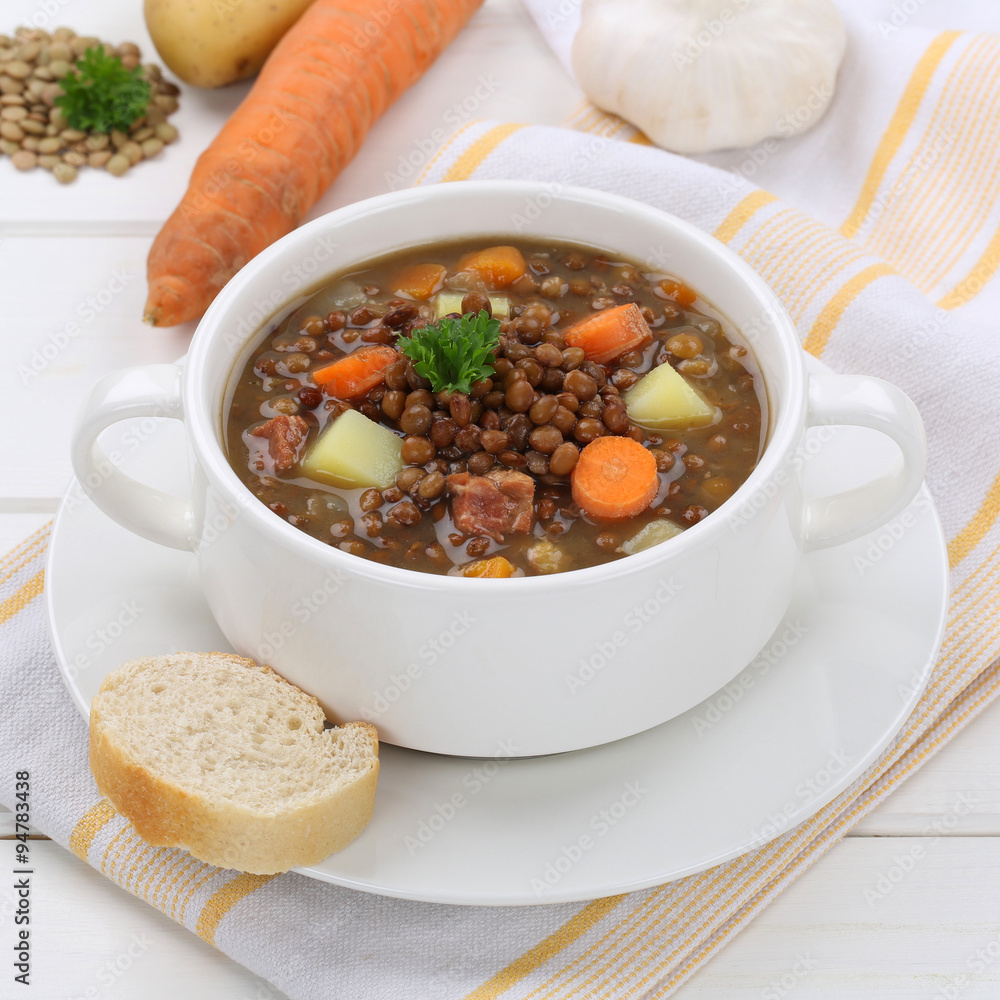 Linsensuppe mit Linsen Suppe in Suppenschüssel gesunde Ernähru