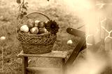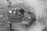 A wicker basket full of fresh fruit. Basket with red apples. Beautiful sunlight. Autumn harvest, harvesting or harvesting.