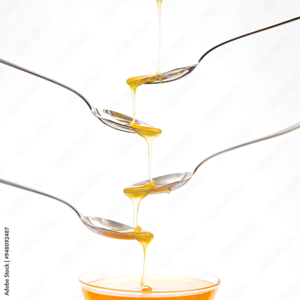 Fresh flower honey drips from a spoon into a spoon on a white background. Organic vitamin food.