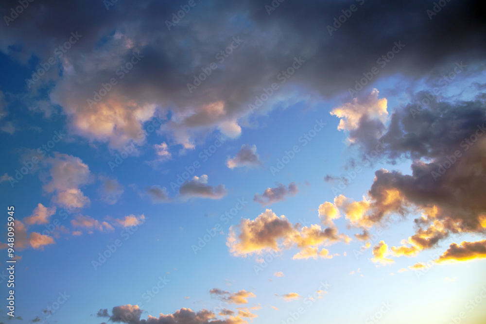 the evening sky after sunset showcases a mesmerizing blend of deep blues and fiery oranges, with delicate clouds adding texture and depth to the tranquil scene