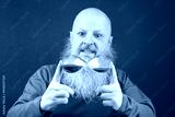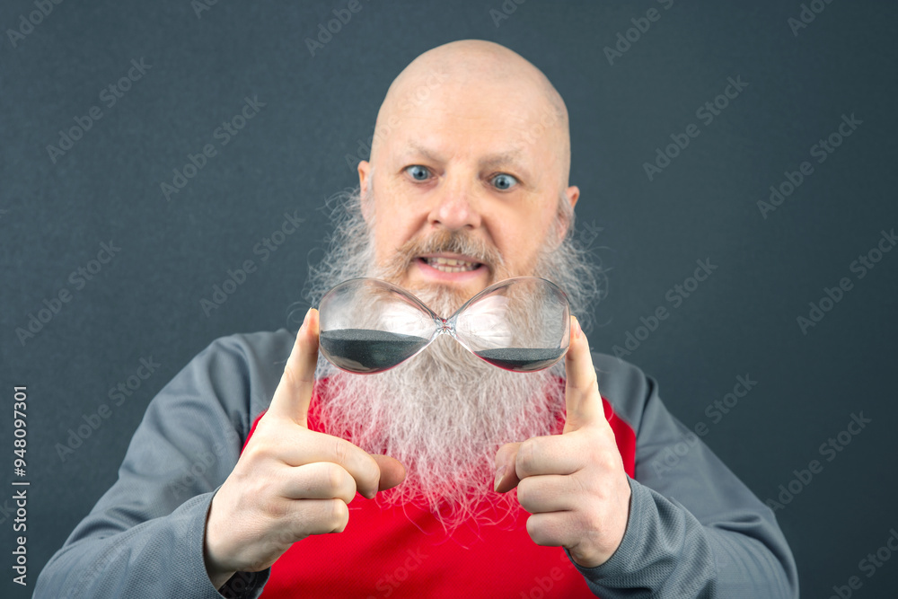 bald man with a large white beard holds an hourglass in his hands. concept of fluidity of life time