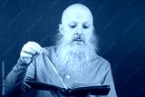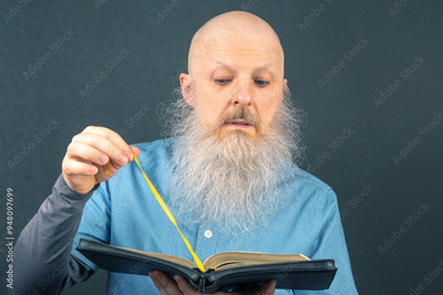 wise old man with a prominent gray beard engrossed in studying the holy bible on a muted dark gray backdrop, symbolizing devotion and spiritual reflection