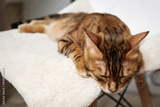 A Bengal cat sleeps on a chair