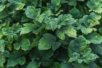 Natural background of Viburnum opulus ‘Nanum leaves. Selective focus.