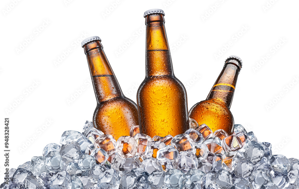 Three cold bottles of beer in ice cubes. File contains clipping path.