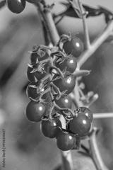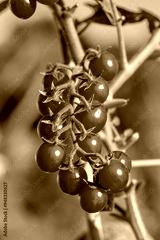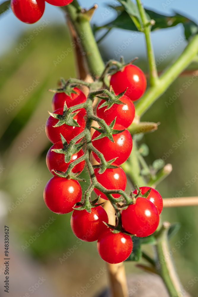 Cherry tomatoes cluster on tomato plant close up. Blue sky at the background. Vertical shot.