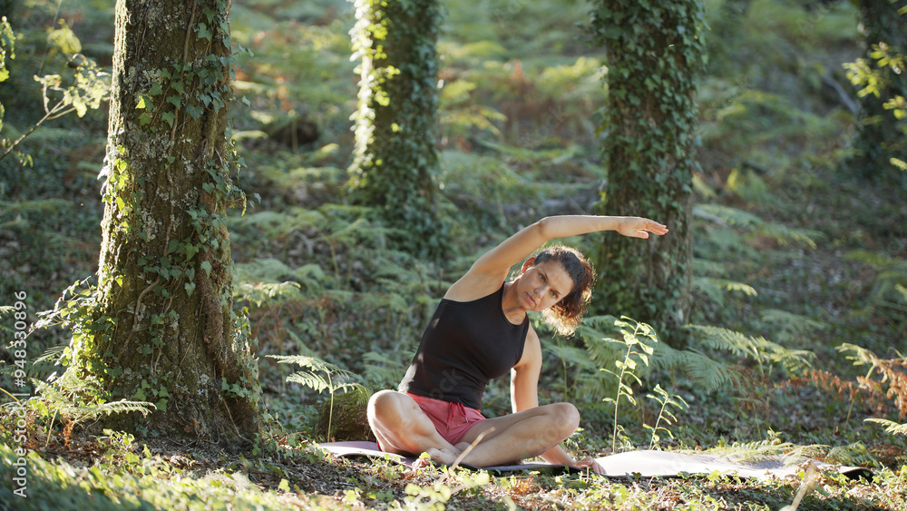 Woman is practicing yoga in nature in the beautiful green summer forest.