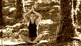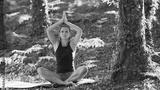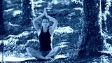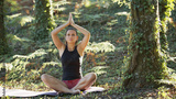 Woman is practicing yoga in nature. Seated gentle easy pose for relief.