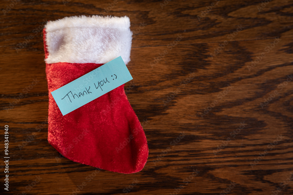 A blue note with the words "Thank You" written on it is placed on top of a red Santa Stalking.