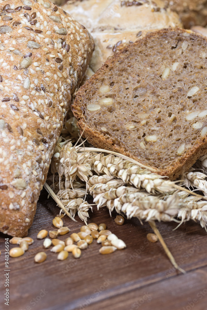 Closeup view of wholemeal bread and pastries. Vertically.