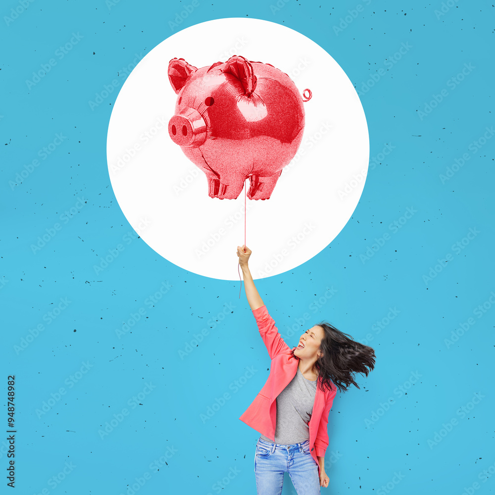 Woman holds a piggy money box as a balloon in her hand. Successfully increasing savings concept.