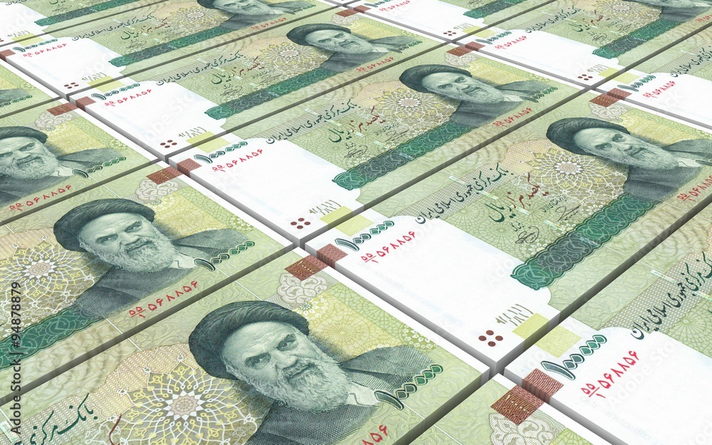 Iranian rials bills stacked background. Computer generated 3D photo rendering.