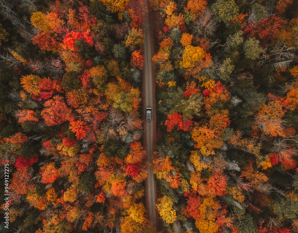 Overhead View Autumn of Camper Van Driving Forest Road. Colorful Trees Looking Straight Down Scenic Landscape Moody Autumn Vibes