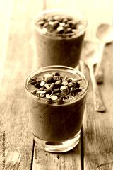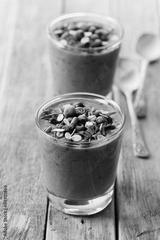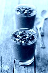 Healthy breakfast of smoothie, dessert, yogurt or milkshake with frozen berry and oats decorated grated chocolate on wooden vintage table