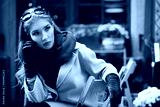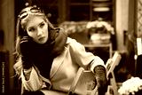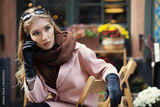 Portrait of beautiful stylish young woman sitting in street cafe . Model looking aside. City lifestyle. Female fashion.