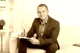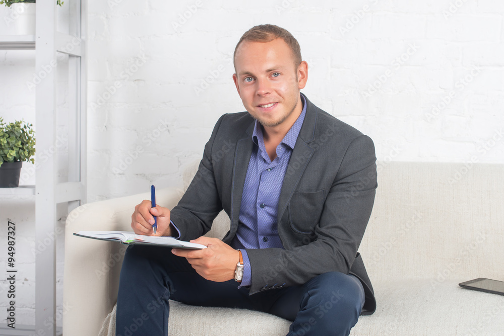 Handsome businessman sitting on couch with notebook at home in the living room, looking camera.