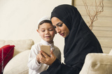 Arabian family, Arabian mother and son using mobile phone