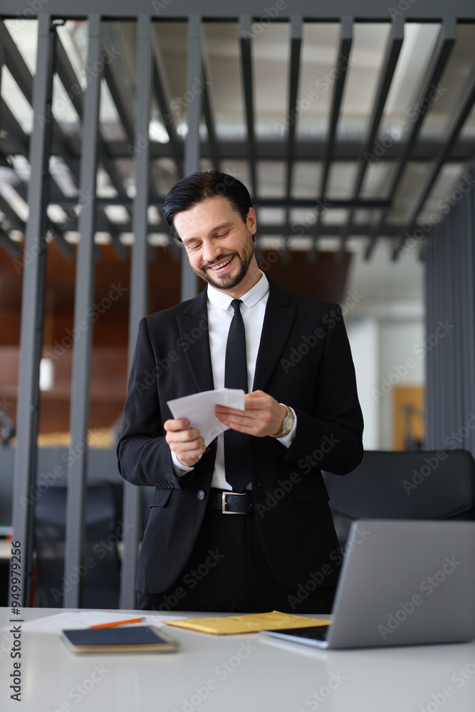 A man in a suit is smiling and reading a piece of paper. He is wearing a tie and he is in a professional setting