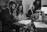 Business people analyzing charts for a sustainable future with windmills on table