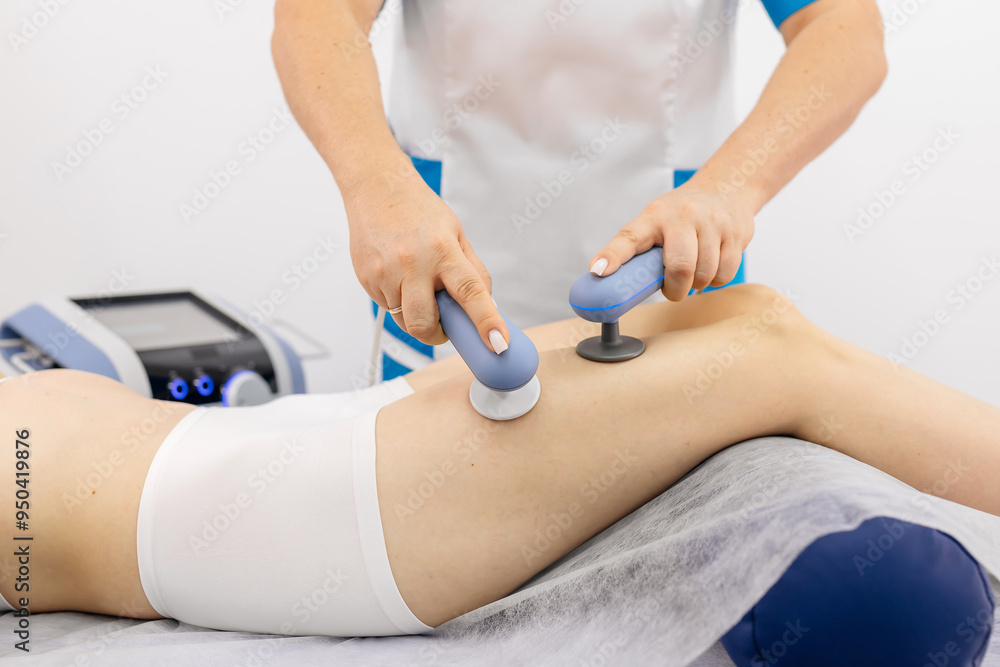 A professional physiotherapist administers electromagnetic therapy to a young woman in a state-of-the-art clinic. This advanced treatment aids tissue repair, alleviates pain, and boosts muscle recover