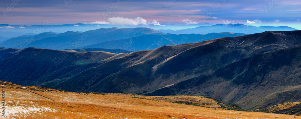 Panoramic views of the autumn mountains and peaks covered with the first snow at sunset.