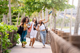 Three women walk together on a wooden pathway surrounded by lush greenery. They are laughing, with arms around each other, exuding joy and friendship on a sunny day in a tropical setting.