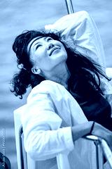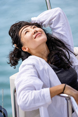 A woman of Asian ethnicity in a white shirt relaxes on a boat on a sunny day, smiling warmly. The leisurely atmosphere on a yacht. Holiday and travel concept.