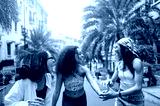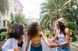 Three young women of diverse backgrounds joyfully holding hands and running down a sunny, palm-lined street in a vibrant, urban neighborhood. Their laughter and energy capture the spirit of friendship