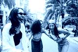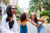 Three young women of diverse backgrounds joyfully holding hands and running down a sunny, palm-lined street in a vibrant, urban neighborhood. Their laughter and energy capture the spirit of friendship