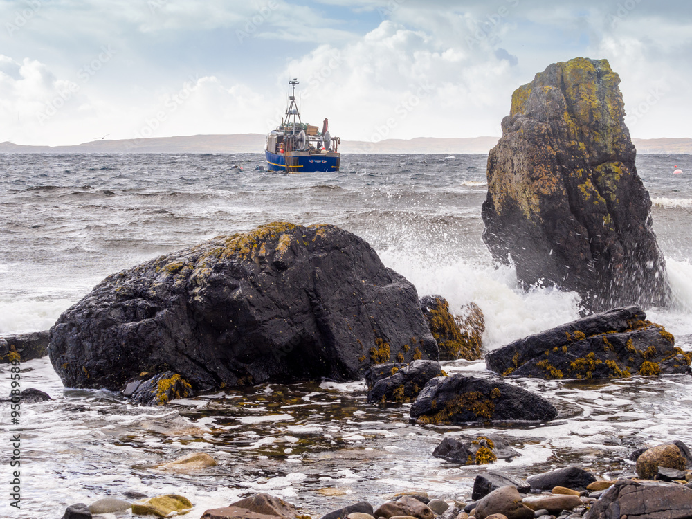 Waves crashing on rocks on beach in rough weather, Elgol, Isle of Skye, Scotland, UK