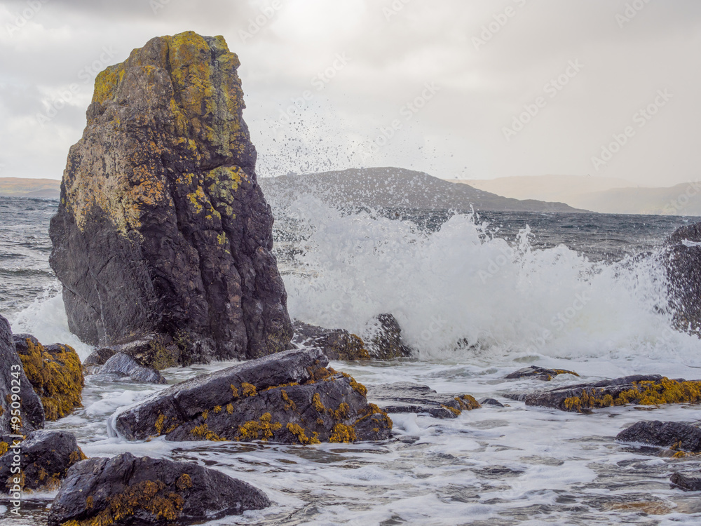 Waves crashing on rocks on beach in rough weather, Elgol, Isle of Skye, Scotland, UK