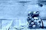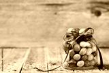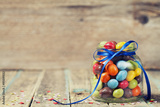 Colorful candy jar decorated with a bow against rustic wooden background, birthday concept