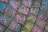 Pavement blocks painted by kid with art chalks together, Mostly pink blue and yellow colors