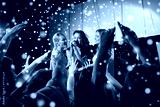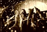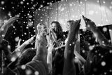 happy young women singing karaoke in night club