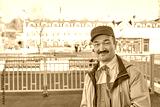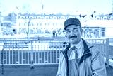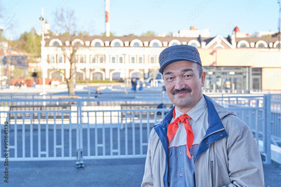 Senior Asian smiling man in red pioneer tie in soviet holiday Pioneer Day.