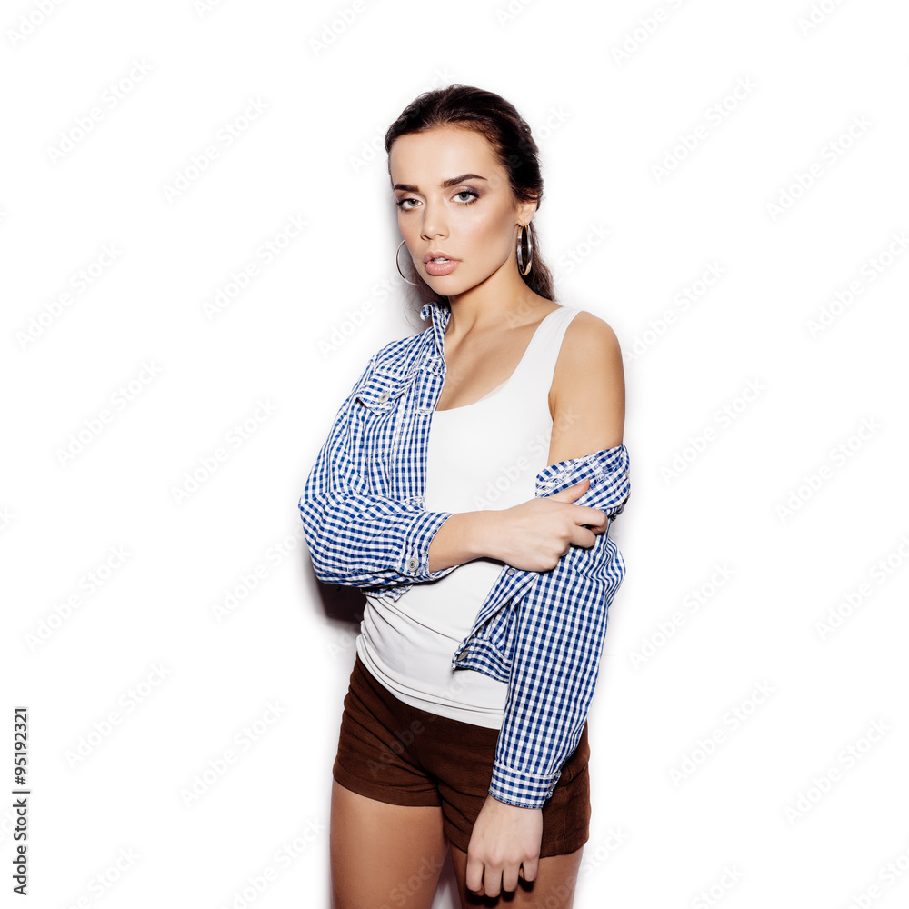 Girl in blue plaid shirt on white background not isolated