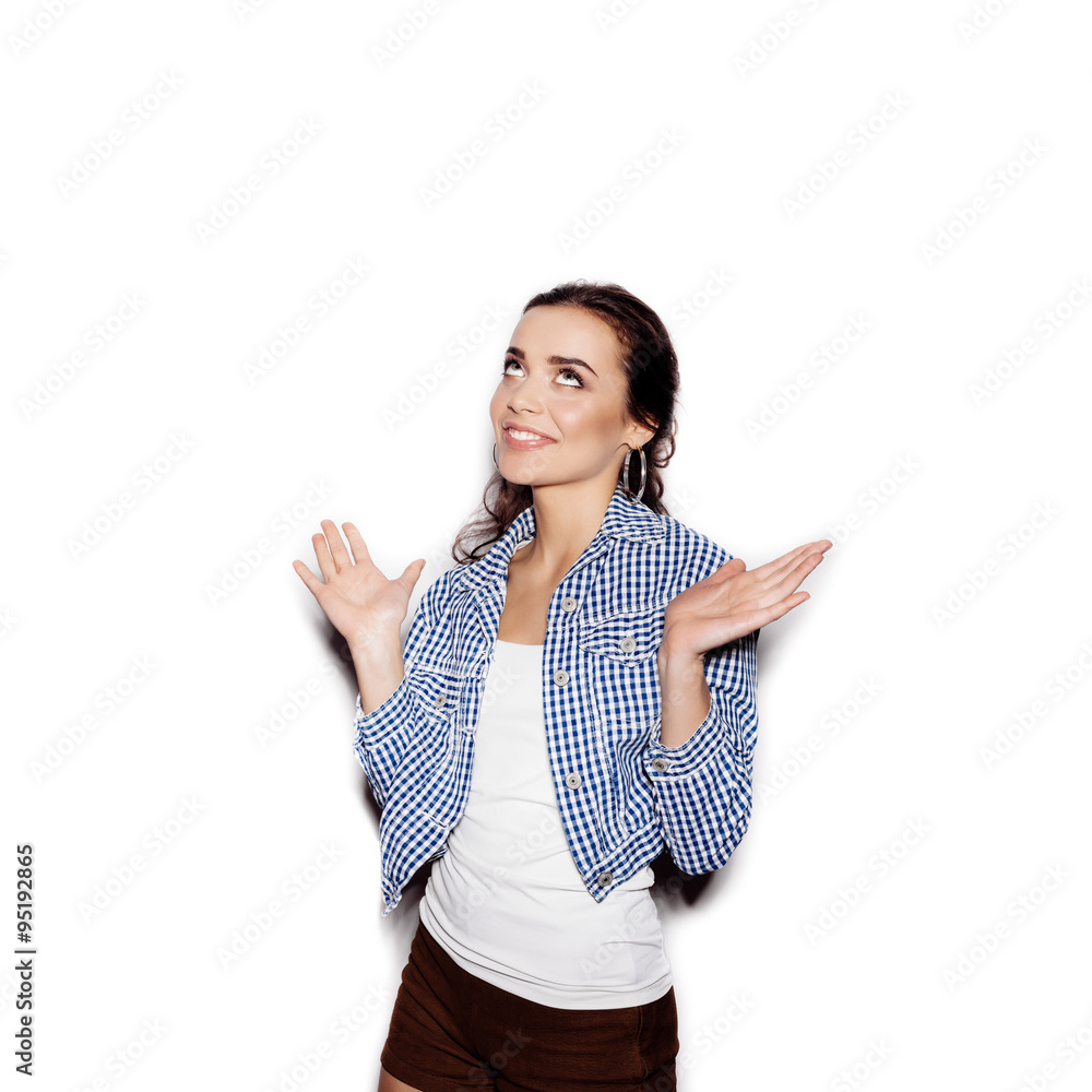 Cute happy woman in blue plaid shirt on white background
