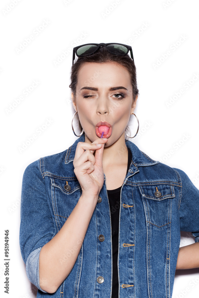 Fashion Girl wearing blue jeans jacket licking candy