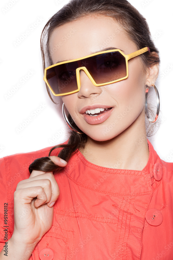 Youngcute female model in sunglasses on white background
