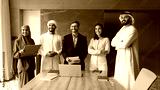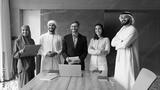 Multiethnic of happy Arabic and European business leaders, partners, entrepreneurs standing together at office large table, smiling, looking away, posing for group portrait after meeting