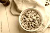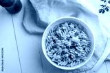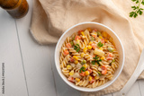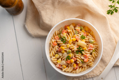 Homemade macaroni salad with trivelle pasta and canned tuna, carrot, Green Pea, corn and mayonnaise dressing in a white plate on wooden table.Top view.
