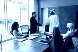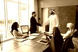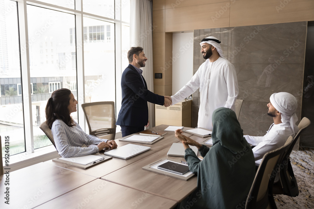 Positive confident Arab and European businessmen shaking hands at team meeting, standing at large table, talking, smiling, laughing, discussing contract, deal, partnership