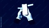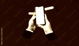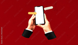 Hands holding smartphones texting. Mobile phone and message box with black screen on red background. Art collage digital pop modern art.