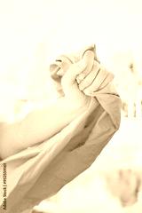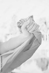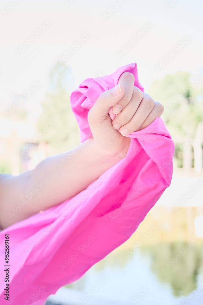 hand of an unrecognizable woman tightly holding a pink cloth scarf, a symbol of the fight against breast cancer