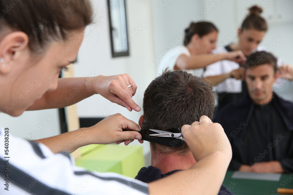 group of students talking and writing at school