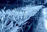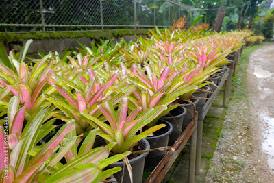 Bromeliad pink and red with green leaf tropical plant in garden.