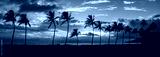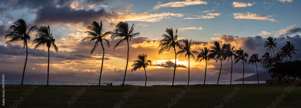 A row of tall palm trees stands silhouetted against a vibrant sunset from Kalama Park in Kihei, on the island of Maui, Hawaii.
